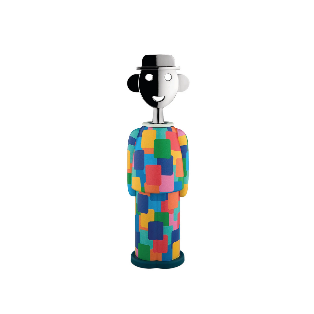 Il cavatappi Alessandro M., in EDIZIONE LIMITATA, è l’autoritratto del suo autore, Alessandro Mendini. Non è stata semplice l’impresa di dar vita a un personaggio capace, in un continuo trasformismo, di inserirsi con garbo nello scenario del design.
