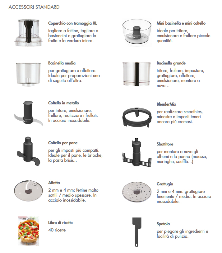 ACCESSORI: bacinella grande da 2,6 l., capacità liquido da 1l.Tramoggia XL. Minibacinella, bacinella media, coltello in metallo, BlenderMix (per smoothies), coltello per impasti, sbattitore, affetta/grattugia da 2 e 4 mm. Scatola accessori, libro di ricette e APP gratuita