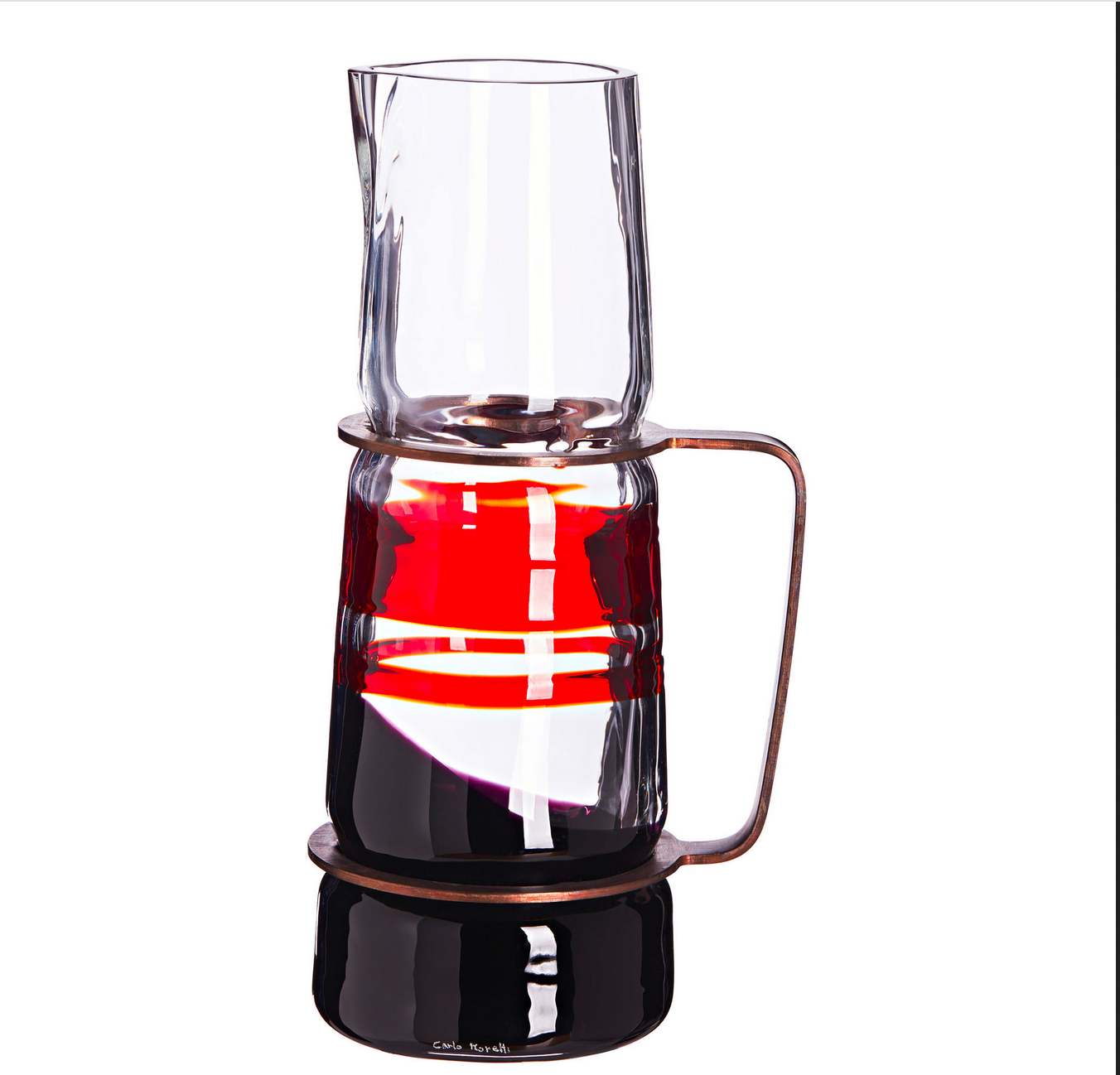 Caraffa soffiata a bocca incorporando il manico direttamente nel vetro, donando al frame in acciaio inox un effetto brunito.